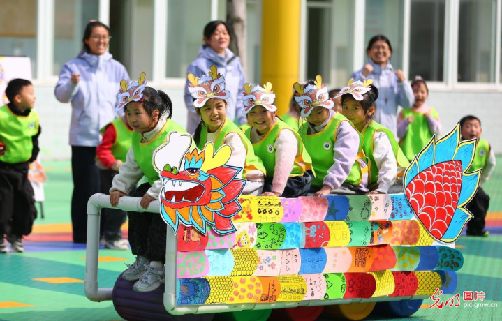 2026年3月20日,在山东省滕州市北辛街谈中心幼儿园“二月二”龙昂首主题步履中,小一又友们插足“旱地龙舟”趣味比赛,欢庆传统节日。(李志军摄/光明图片)