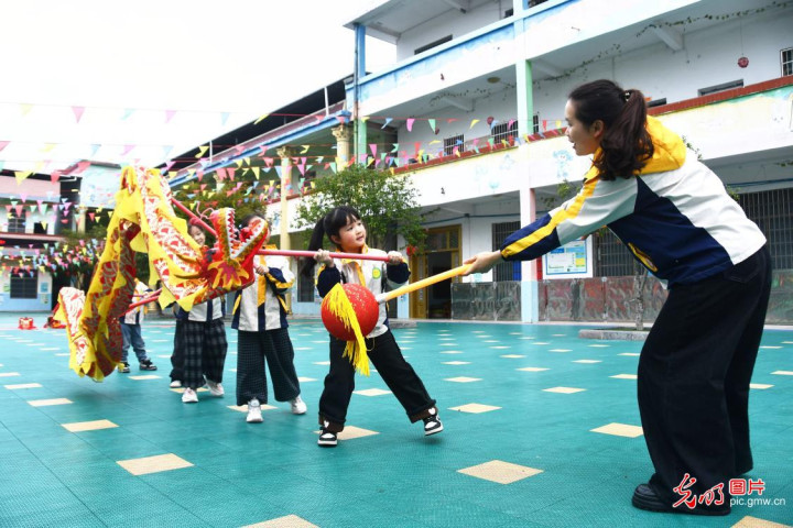 2026年3月20日,湖南省永州市江永县桃川镇中心幼儿园开展舞龙体验步履,欢庆“二月二”龙昂首,让孩子们感受传统文化魔力。(田如瑞摄/光明图片)