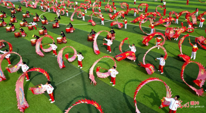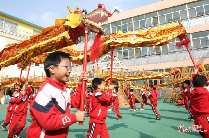 2026年3月20日,在山东省滨州市博兴县本质小学附庸幼儿园,小一又友体验传统舞龙,欢庆“二月二”龙昂首,感受中华传统文化魔力。(陈彬摄/光明图片)