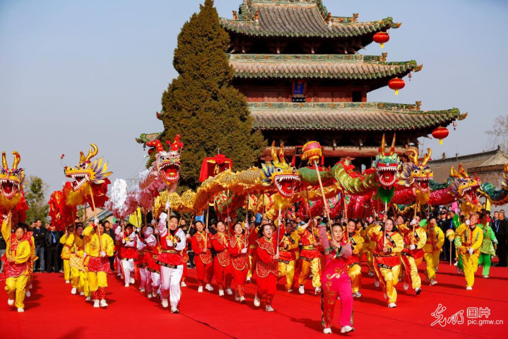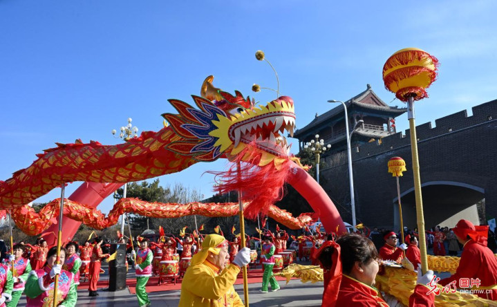 2026年3月20日,舞龙队在河北省张家口市宣化古城西城墙下饰演舞龙,欢庆“二月二”龙昂首,传承中华优秀传统文化。(陈晓东摄/光明图片)