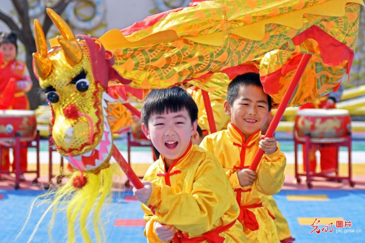 2026年3月20日,山东省烟台市福山区本质幼儿园的小一又友饰演舞龙,欢庆“二月二”。(孙文潭摄/光明图片)