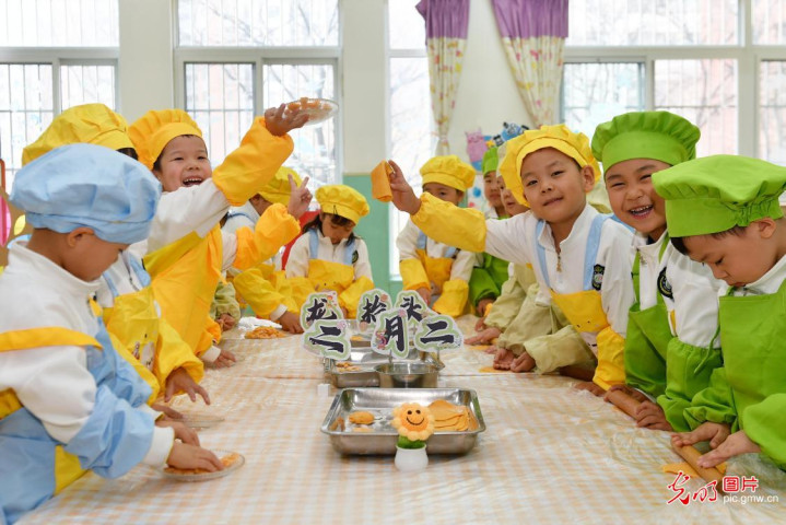 2026年3月20日,小一又友们在山东省青岛市市北区宝城幼儿园开展的“二月二”传统民风步履上学作念棋子好意思食。(王海滨摄/光明图片)
