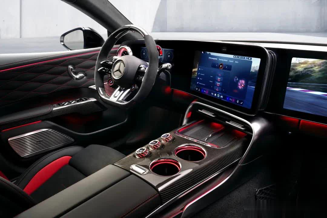 与之前的V8车型比拟,这款新的高性能电动车的按钮和开关要少得多,因为AMG将空调竣事集成到了中央裸露屏里。中控台上装配了三个旋转旋钮,用于转变电动机的反馈、九级牵引力竣事和过弯特色。与信息文娱系统和中央空调出风口相通,这些开关也朝驾驶员歪斜。