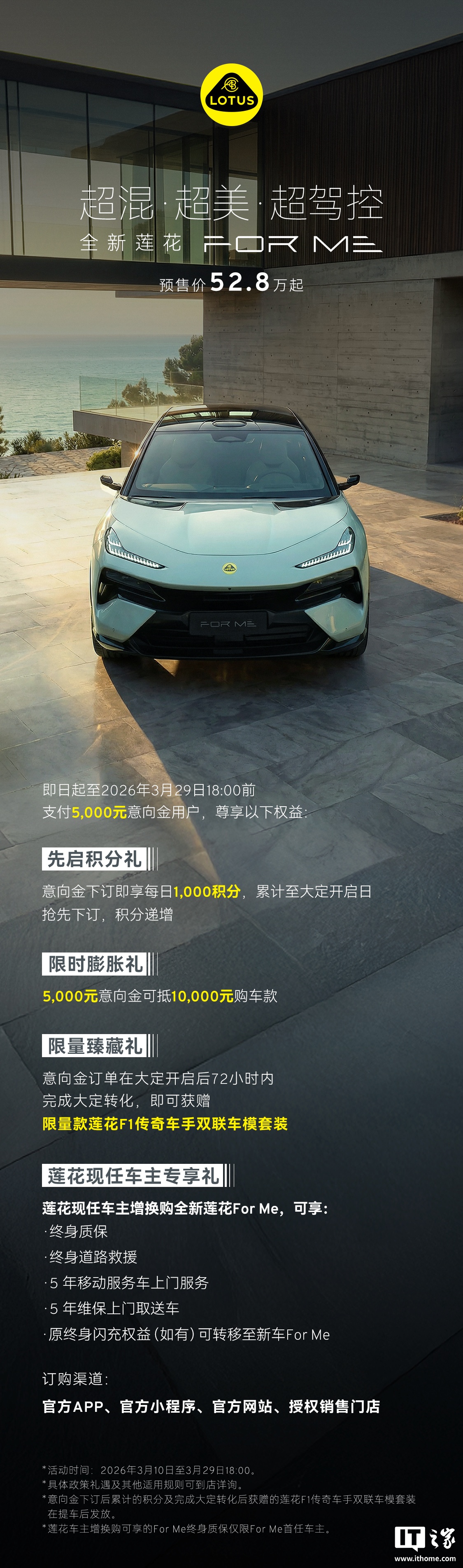 IT之家 3 月 10 日讯息,莲花汽车(Lotus)当天通知旗下首款羼杂能源车型 —— 莲花 FOR ME 郑重开启预售,该车型共推出两款成立,预售价钱辞别为 52.8 万元和 58.8 万元。