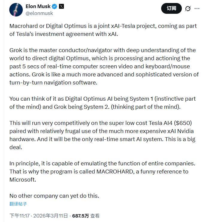 好意思东时候11日周三,马斯克在旗下酬酢媒体发帖晓谕,特斯拉与他的AI初创公司xAI将麇集开垦一个名为“Digital Optimus”(数字擎天柱)、又称Macrohard(巨硬)的新AI技俩,旨在打造大约自动施行软件任务的AI智能体系统。