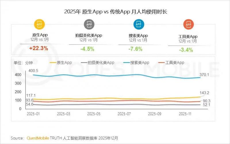 汇报泄露,由于AI的才调迭代、与场景的集中深度加强,用户对AI的使用风尚正在造成。一方面,用户量举座急剧增长,江南体育(JNsports)官网app下载2025年12月,转移端、PC端AI举座领域别离为7.22亿、2.05亿;另一方面,用户黏性捏续提高,AI原生类App月东谈主均使用时长达到143.2分钟,仍是远远越过了器用类、拍摄好意思化类App的90.3分钟、52.1分钟。