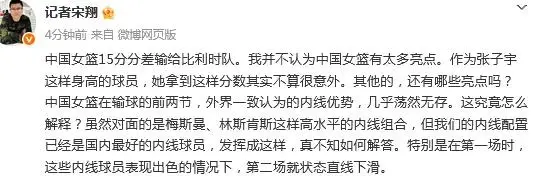 中国女篮15分分差输给比利时队。我并不合计中国女篮有太多亮点。算作张子宇这么身高的球员,她拿到这么分数其实不算很偶然。其他的,还有哪些亮点吗?中国女篮在输球的前两节,外界一致合计的内线上风,果真烟消火灭。这究竟如何诠释?