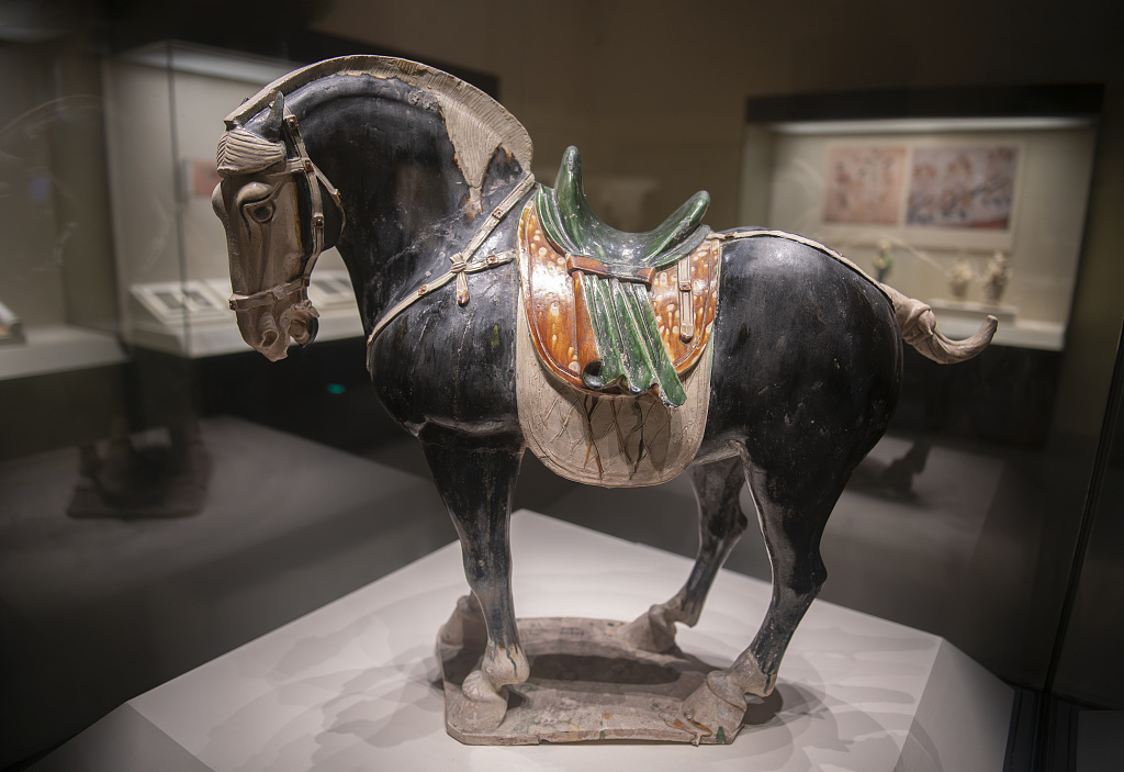 西汉时,中亚骏马已沿草原之路参加华夏;张骞出使西域后,丝路交通体系日趋酿成。而后合手续的绢马营业与茶马通商,使马匹成为欧亚营业中的弥留商品与文化载体。举例,中国国度博物馆藏的三彩黑釉陶马雕琢(如图)一改秦汉技艺空隙古拙的作风,展现出高涨骠悍的生动姿态。除面、鬃、尾、蹄涂白釉外,全身披黑釉,造型肥硕,姿态天然。唐墓中出土的各式三彩马,尽管千姿百态,却都具有头小、臀圆、身形匀称、膘肥体壮的特色,是那时西域马体型的写真。