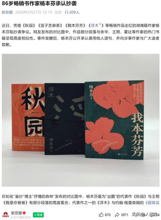 今天,各大媒体齐在报谈86岁畅销书作者杨本芬承认抄袭的音信。