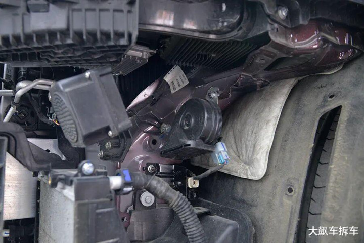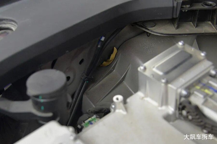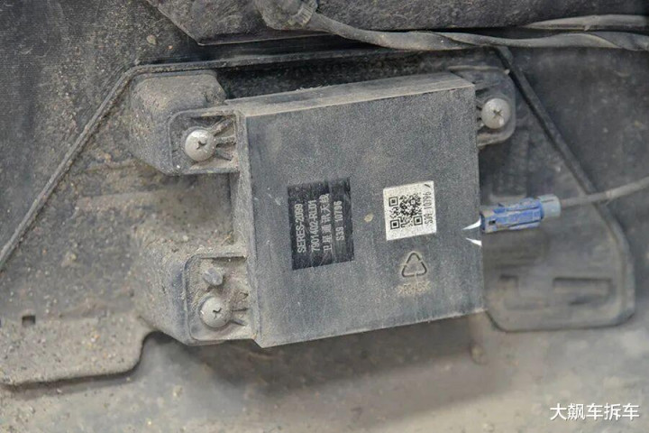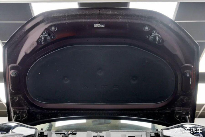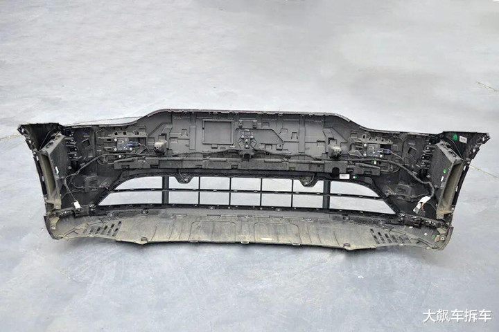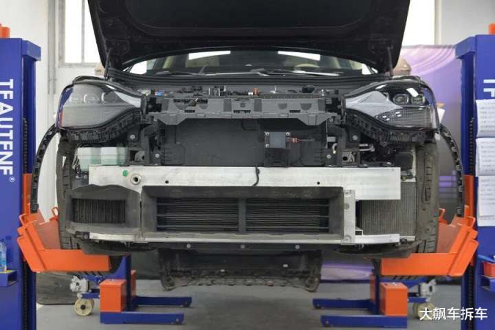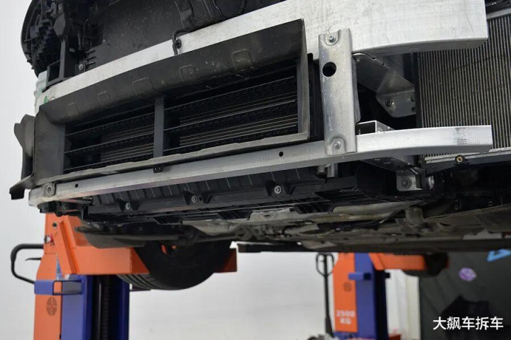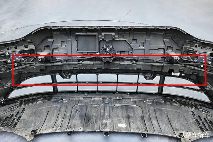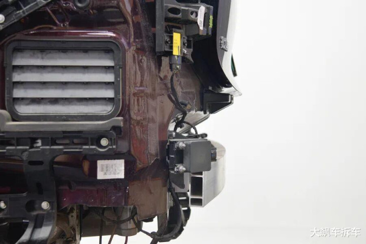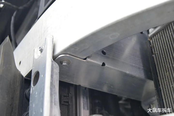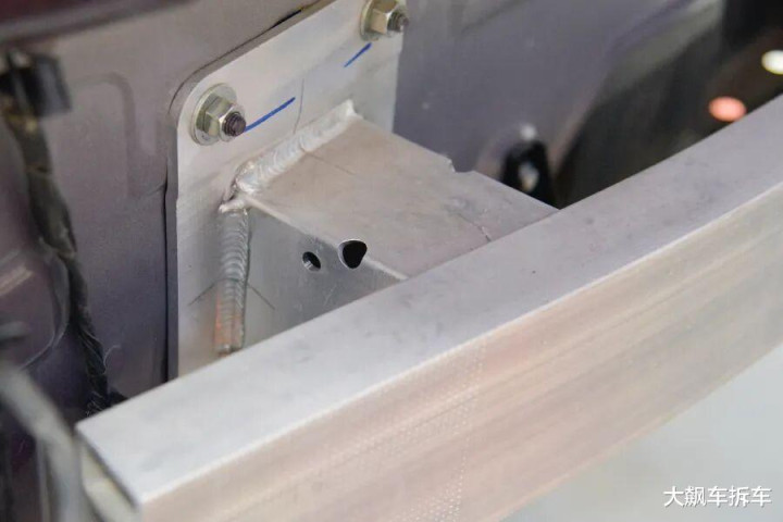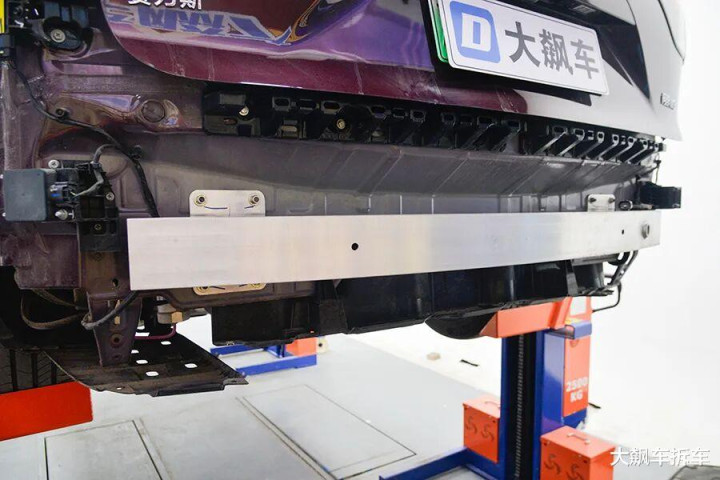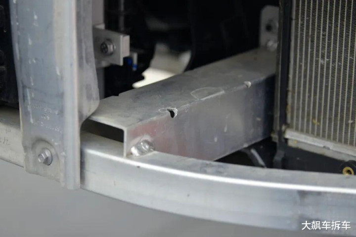 拆掉这辆车前保障杠,能看到有一根宽宏的铝合金前防撞梁,厚度为2.83毫米,能遮蔽车头的71.94%。