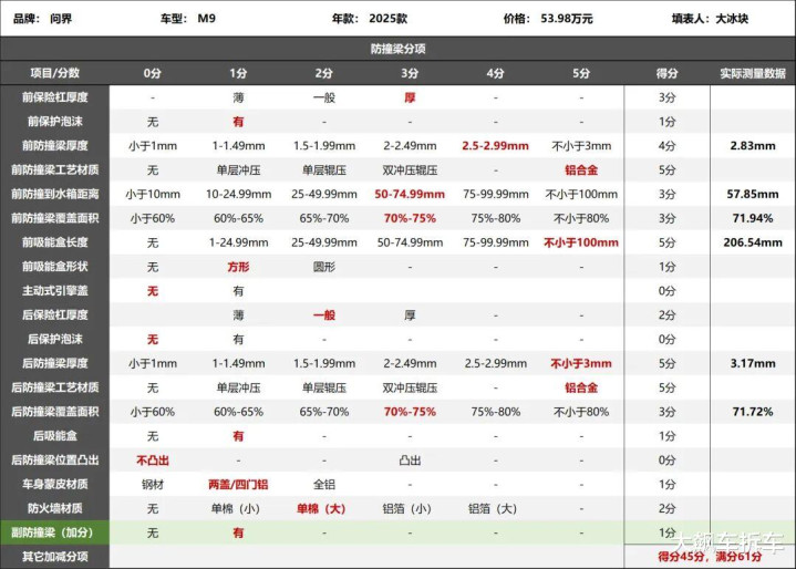 2025款问界M9防撞梁评分