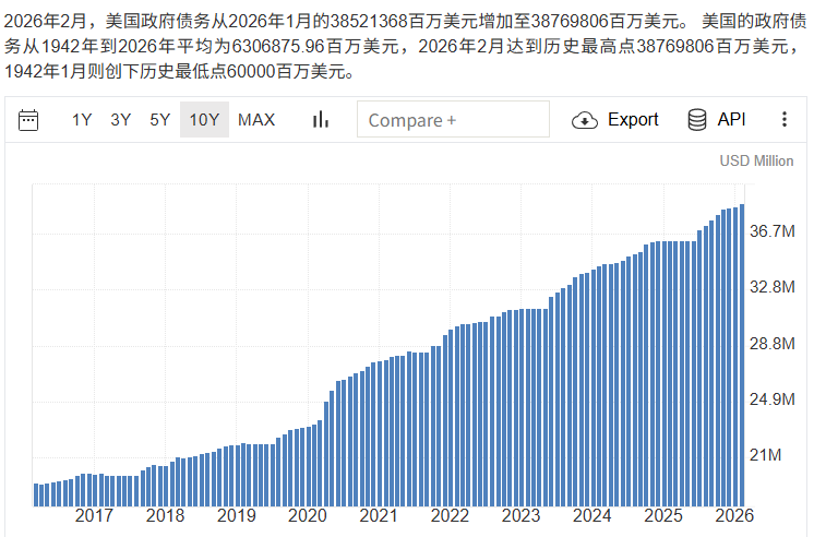 目前的好意思国联邦政府债务与1970年代也曾不行视归并律,2026年的数值为约38万亿好意思元,为GDP的130%傍边 Tradeeconomics