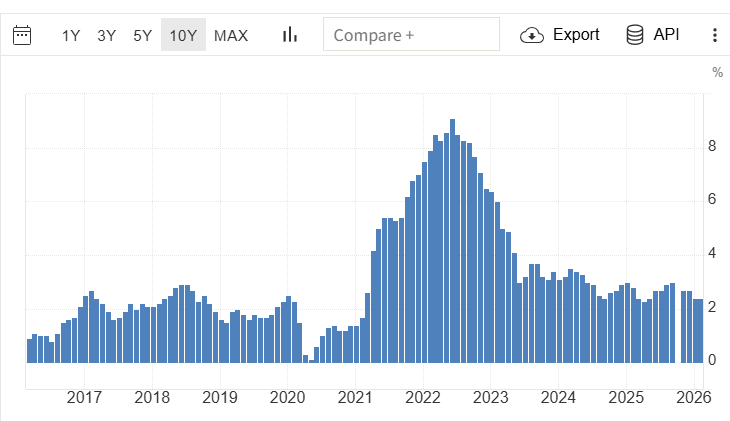曩昔十年好意思国的通胀走势图 Tradeeconomics