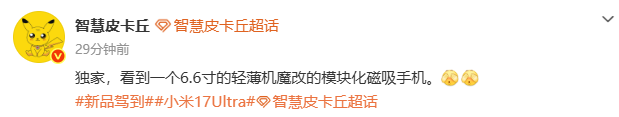【CNMO科技音尘】3月10日,有业内东谈主士骄贵,某手机厂商(疑似小米)正奥妙研发一款配备6.6英寸屏幕的浮薄型模块化磁吸手机,部分不雅点觉得这可能是小米下一代MIX系列机型的变嫌尝试。