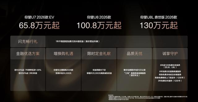 3月5日,在比亚迪第二代刀片电板暨闪充时期发布会上,仰望汽车认真推出2026款U7、U8及U8L三款旗舰车型,售价区间65.8万元至130万元。新车全系搭载第二代刀片电板与闪充时期,在续航、充电后果及驾乘体验上赶走全面冲破。其中U7 2026款起售价65.8万元,纯电CLTC续航达1006公里,闪充时期可赶走“5分钟补能、9分钟充满”的补能后果,有云辇-Z电悬架与云辇-A智能空气车身边界系统可供遴荐,兼顾操控精确与乘坐振作。