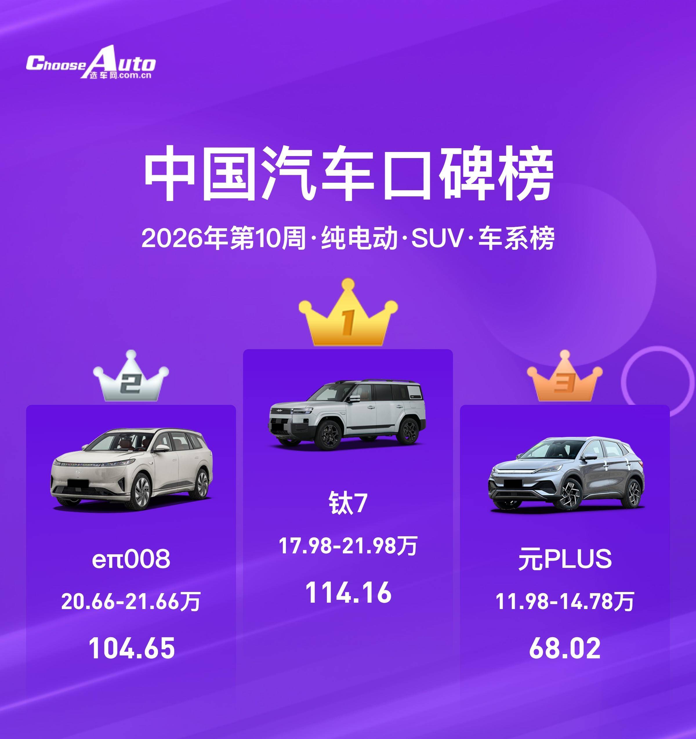 本周纯电SUV榜单前三名:钛7(114.16分)、eπ008(104.65分)、元PLUS(68.02分)。