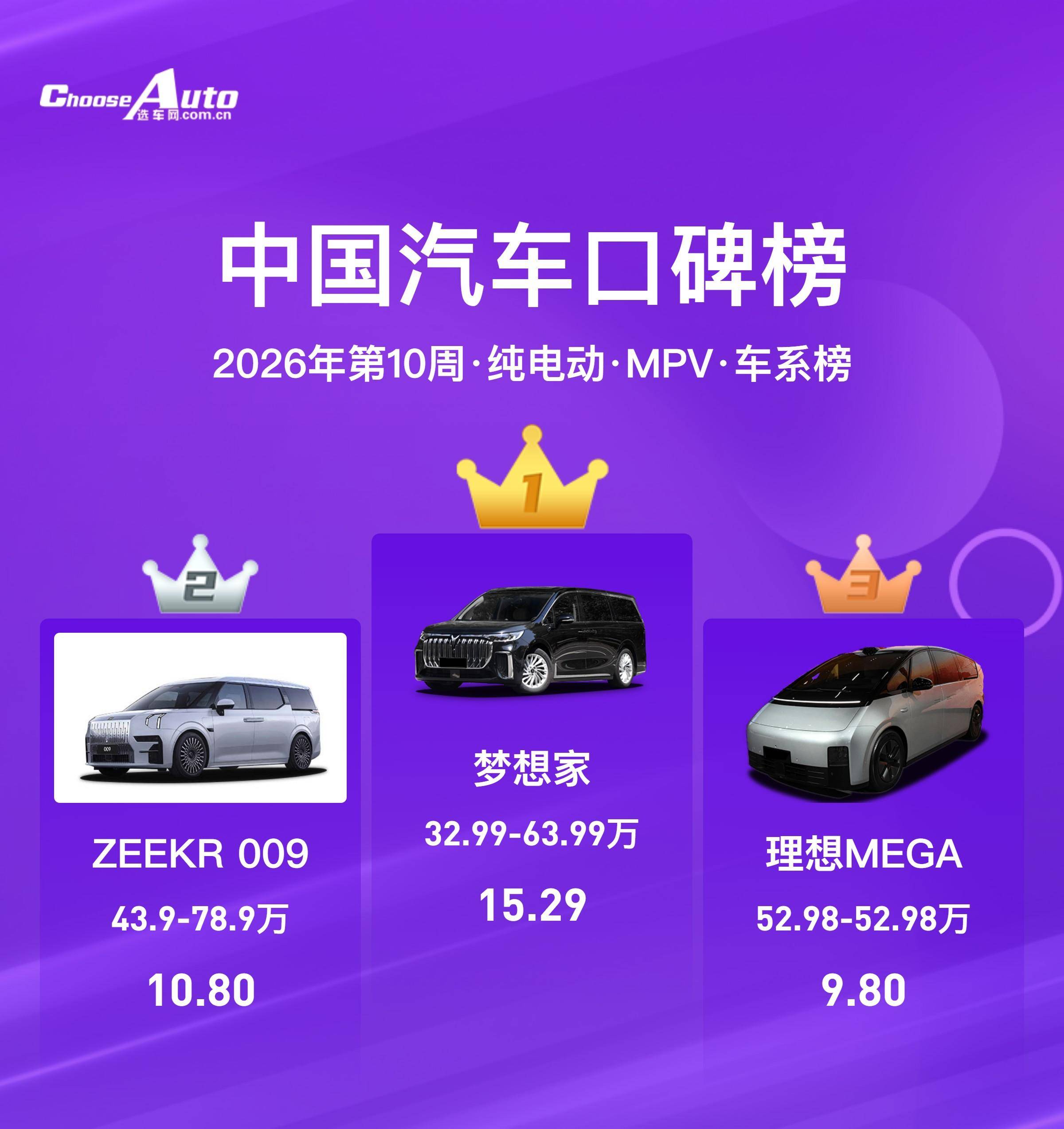 MPV榜单:梦思家(15.29分)、ZEEKR 009(10.80分)、理思MEGA(9.80分)。