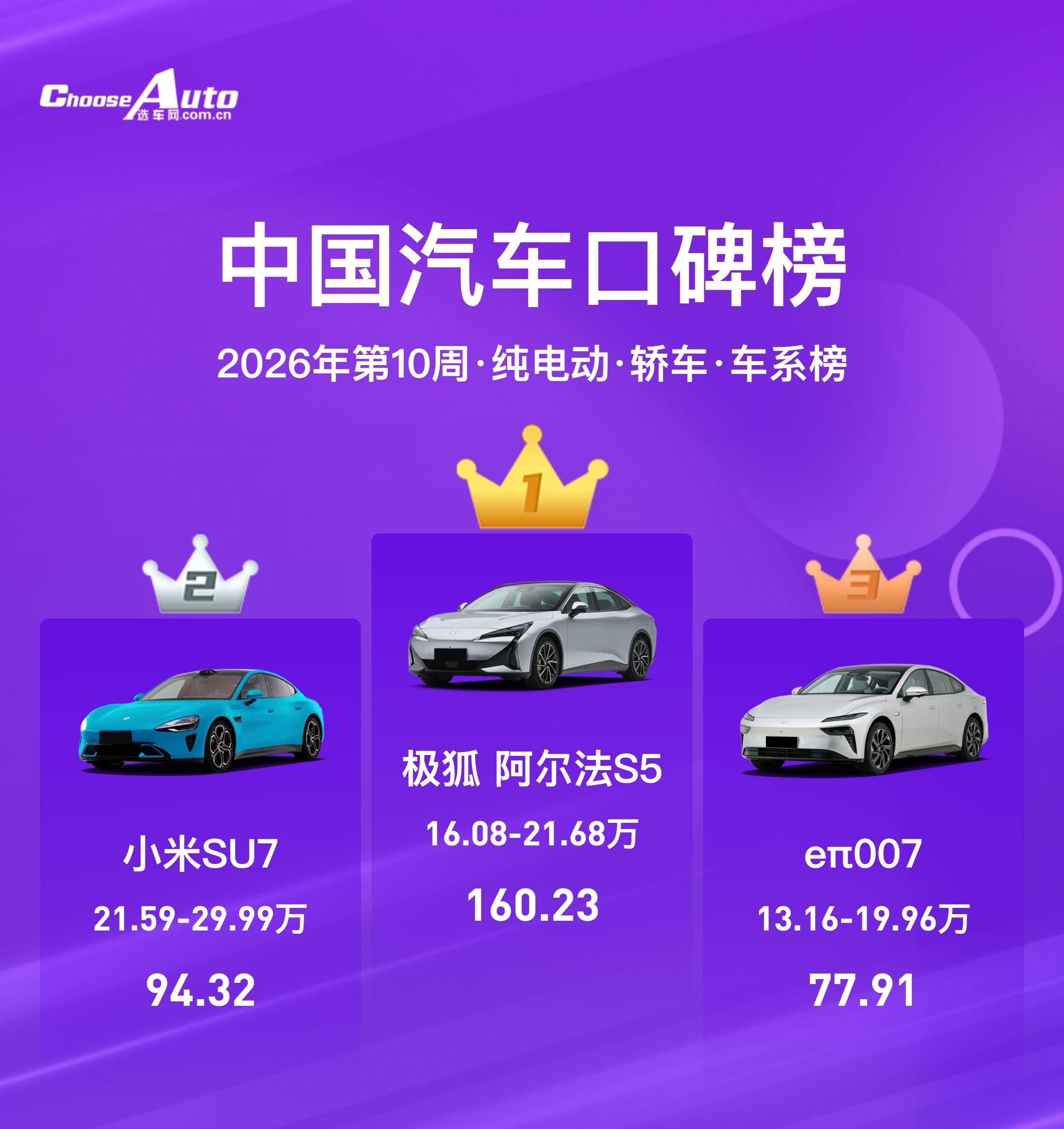 轿车榜单:极狐阿尔法S5(160.23分)、小米SU7(94.32分)、eπ007(77.91分)。