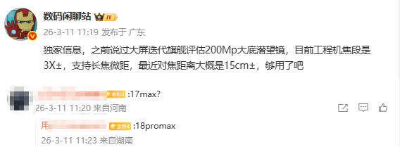 【CNMO科技音讯】3月11日,数码博主@数码谈天站 爆料称,某品牌的大屏迭代旗舰正在评估2亿像素大底潜望镜头决策,当今工程机焦段为3×独揽,并提拔长焦微距功能,最近对焦距离约为15cm。集中探究区信息来看,这款新机或者率是小米18 Pro Max。