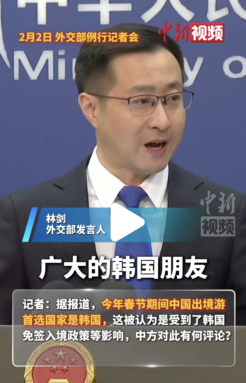 2月2日社交部例行记者会上,有记者提议本年春节时期,中国东说念主出境游首选是韩国。社交部发言东说念主林剑趁势邀请庞大韩国一又友来华过年。