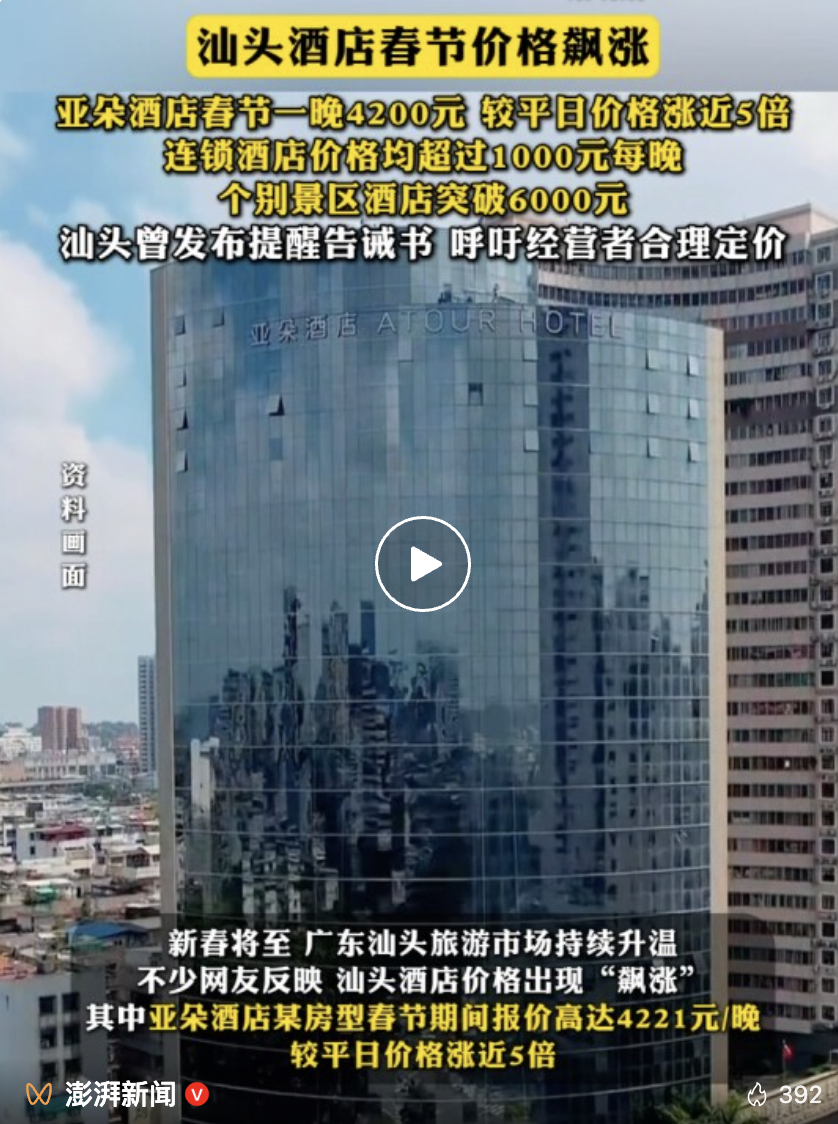 汕头部分货仓价钱已超上国际滩,其中亚朵货仓某房型春节时期报价高达4221元/晚,较正常价钱涨近5倍。