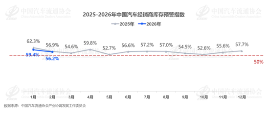 2月28日,中国汽车怒放协会发布最新数据,2026年2月中国汽车经销商库存预警指数为56.2%,同比着落0.7个百分点,环比着落3.2个百分点,指数仍位于50%的枯荣线之上,行业仍存讨论压力。