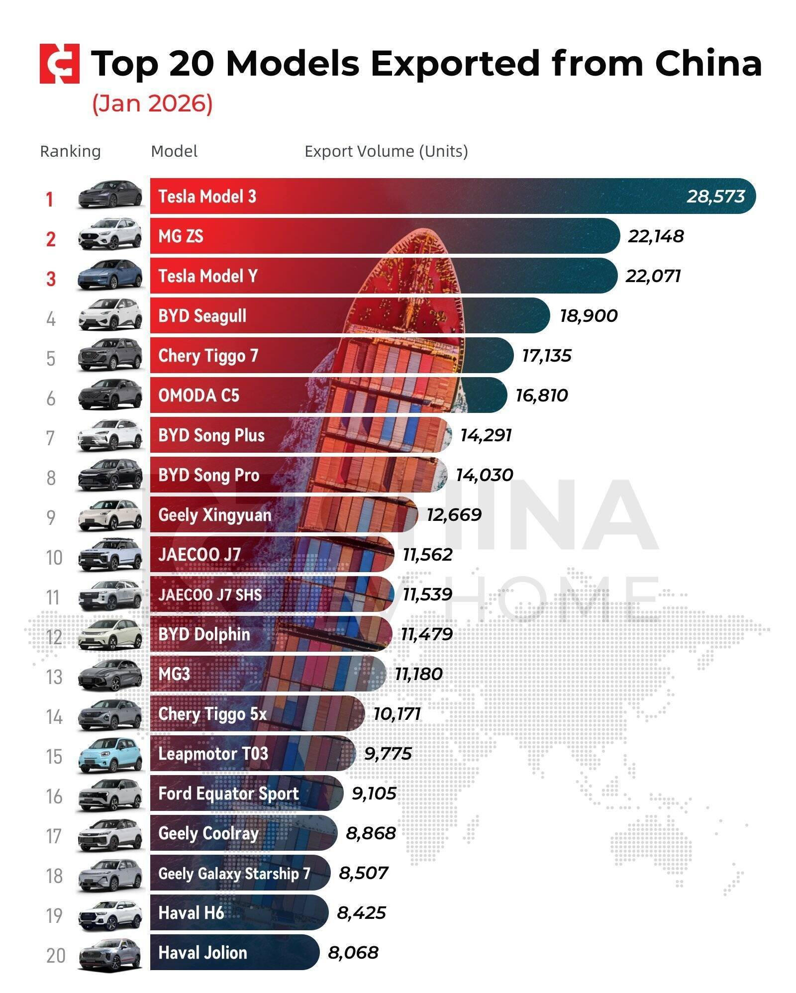 【中国汽车出口的最新统计数据出炉了】2026年1月数据,特斯拉Model 3和Model Y稳居销量榜第一和第三。