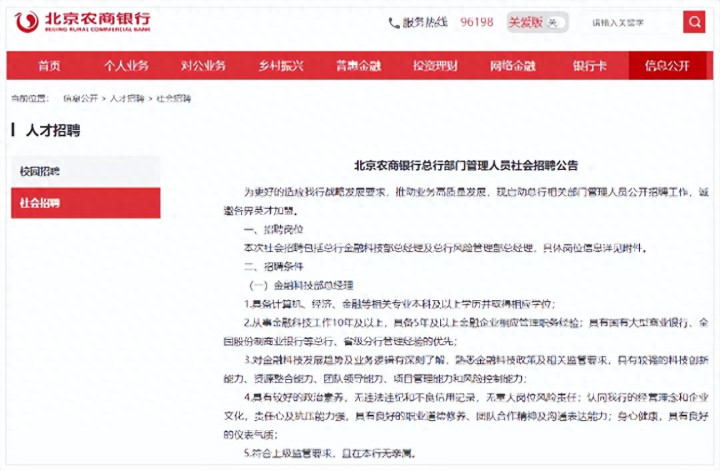 北京农商银行在招募公告中先容,应聘金融科技部总司理需餍足:从事金融科技责任10年及以上,具备5年及以上金融企业相应贬责职务训诲;具有国有大型交易银行、寰宇股份制交易银行等总行、省级分行贬责训诲的优先。