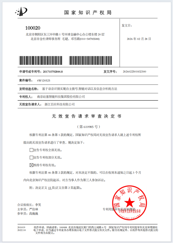 2026年3月5日,国度常识产权局作出重磅审查决定:驳回浙江百应科技第二次专利无效宣告肯求,保管南京硅基智能中枢发明专利一齐有用。
