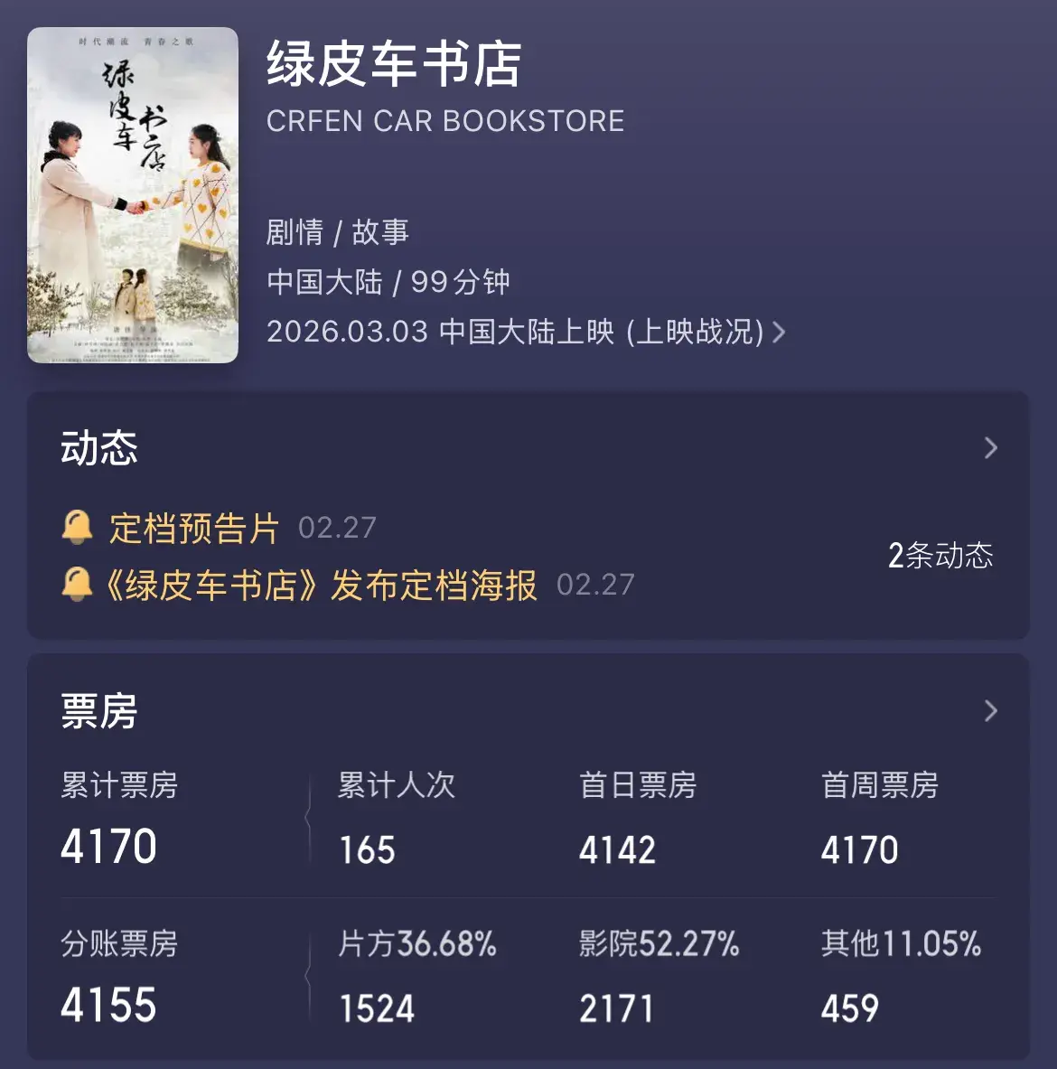 阻挡3月11号,上映第9天,寰球一共165个东说念主看过,累计票房4170块——你没看错,就四千来块。