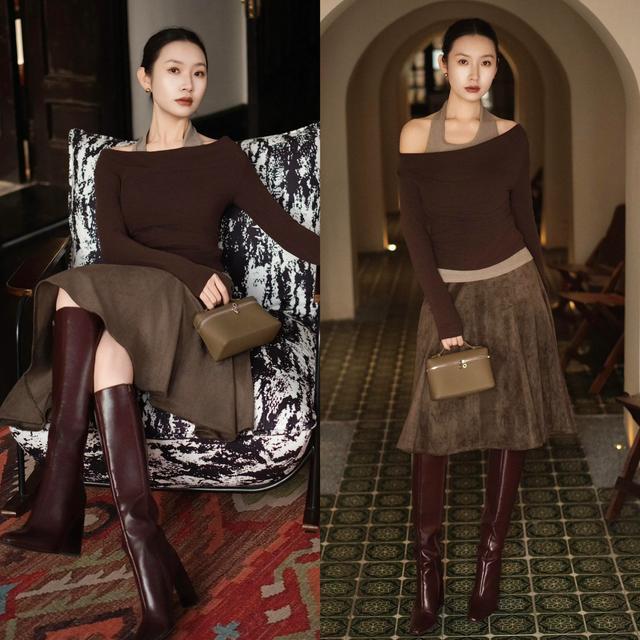 思要穿出高档质感与贵气,不妨可选一件棕色一字肩诚恳上衣,内搭浅棕色挎脖打底,配同色系浅棕色伞裙,脚踩一对棕红色的中筒靴,松紧聚合的搭配决策齐全突显肉体弧线,展浮现天鹅颈与锁骨的上风。