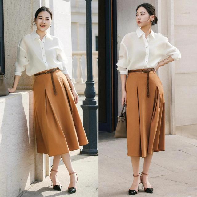 Tips③:白衬衫+驼色伞裙。