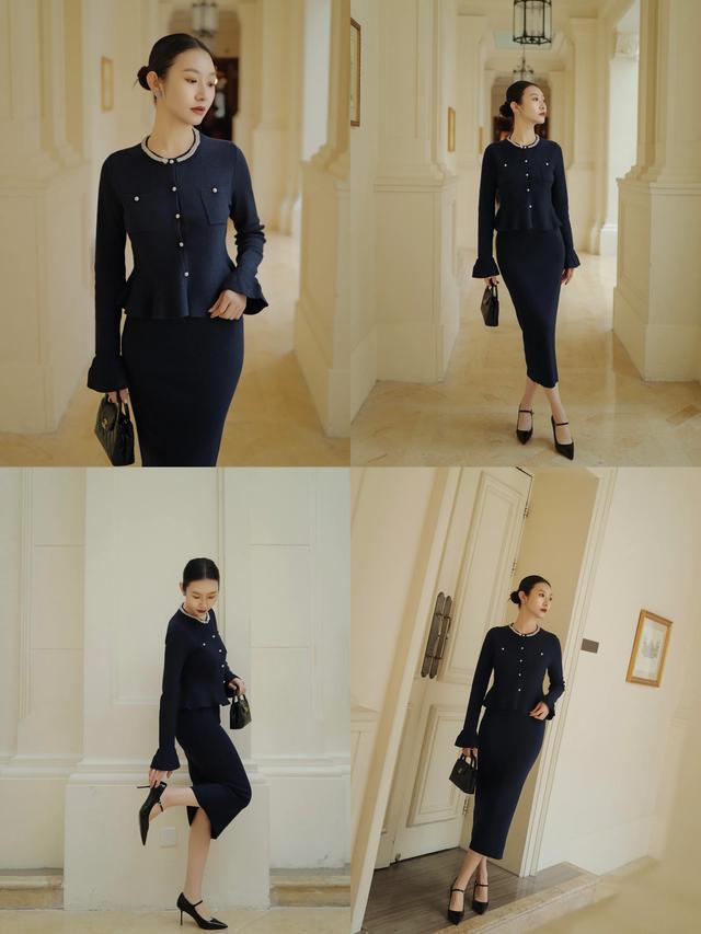 穿这种深色的衣服,经典又耐看,可是需要介怀的是穿这种深色系的衣服一定要顺应的留白,浮现少许小腿的肌肤,这么能使得穿搭者的造型显得灵动,不会千里闷无聊。