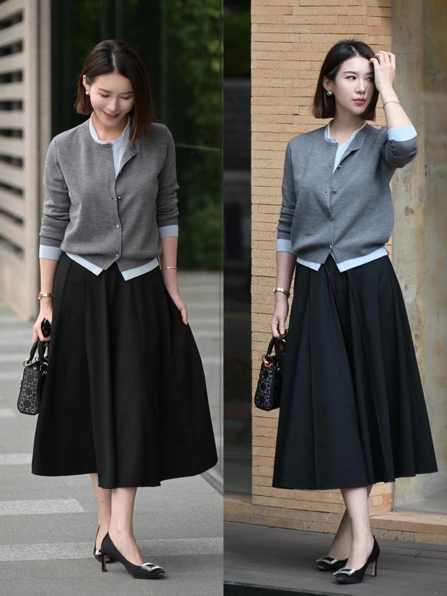 以致我们还不错收受重复的穿搭式样,短款的灰色诚恳开衫内搭蓝色打底衫,加上一条玄色的 A 字半裙,脚踩玄色单鞋,这种撞色搭配档次感更分明。