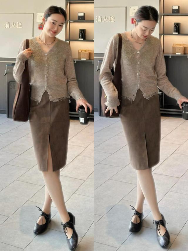Tips②:玄色诚恳开衫+深棕色直筒开叉半裙。