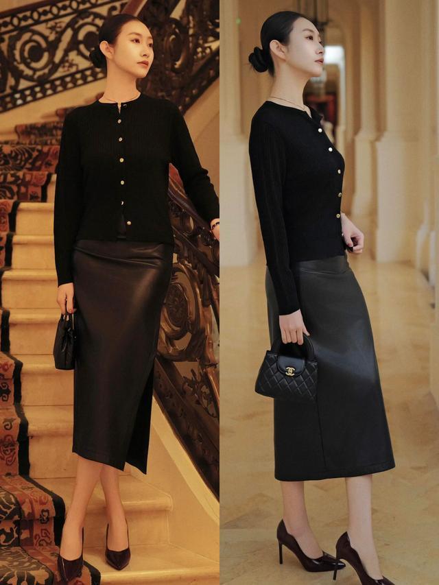 偏疼千里稳大气的穿衣立场,这个春季完全不错选拔一件玄色的圆领诚恳开衫,搭配一条深棕色的皮质开叉直筒半身裙,脚上一稔一对棕红色的细高跟单鞋。