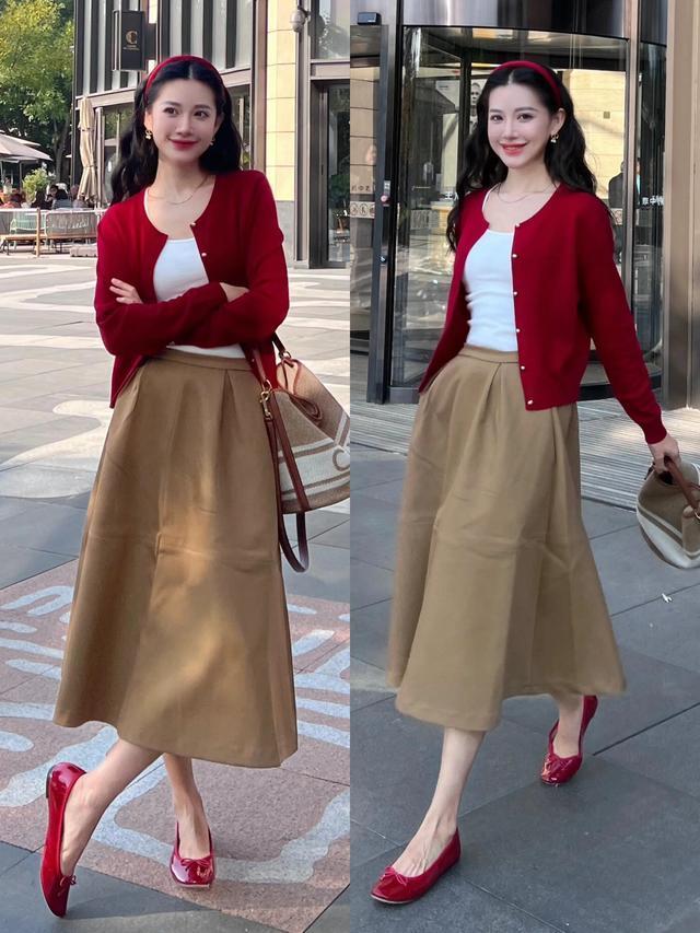 或是选拔一件红色的诚恳开衫内搭白 T 恤,加上一条卡其色的 A 字半裙,脚踩一对红色的玛丽珍鞋。这种色调穿搭让搭配者更显朝气,活力感满满。