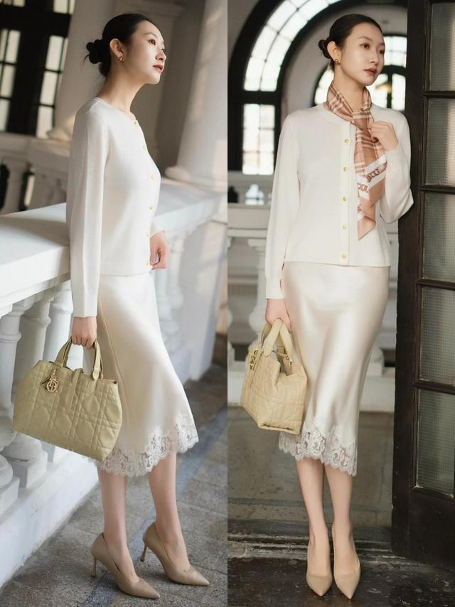 穿裙装时,可顺着我方的情意挑选面目,思穿出轻熟温心绪,就用一件白色诚恳开衫搭配缎绸面料质感的奶白色蕾丝边直筒半裙,脚踩一对卡其色浅口细跟单鞋,梳上浮现的丸子头发型,一整套造型营造出了温婉又大气的视觉戒指,高档优雅。