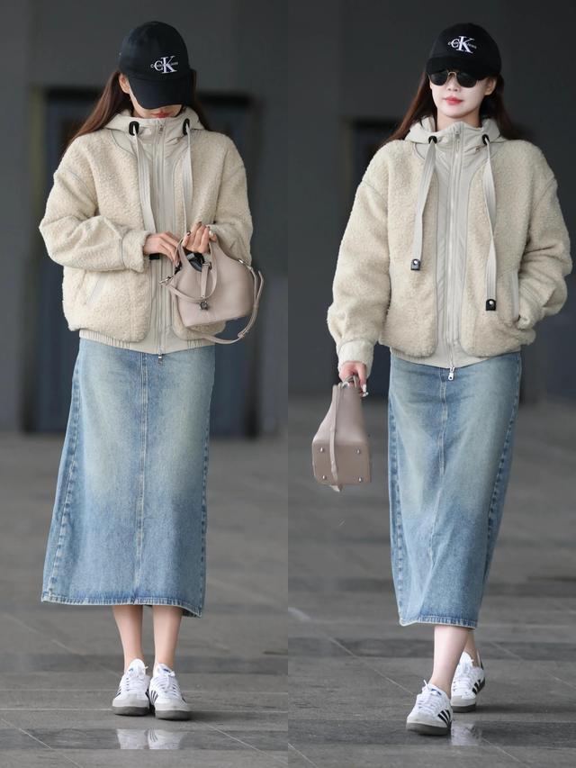 偏疼酷感的穿衣立场,可选卡其色羊羔毛小夹克,配上牛仔直筒半裙,脚踩一对经典面目的德训鞋,再戴上一顶玄色棒球帽与墨镜,随心又帅气,春日街头感径直拉满。