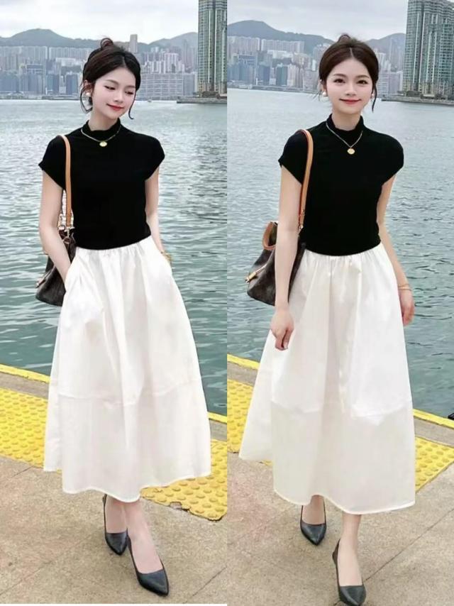 Tips③:玄色诚恳短袖搭配白色 A 字版裙