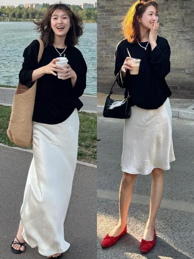 挂牵我方的穿搭出错的情况下,不错径直选拔玄色诚恳短袖搭配上白色的 A 字版裙,脚上穿的玄色的浅口单鞋,恰巧和上衣色调造成呼应,短长色调穿搭经典耐看,但要懂得顺应留白。我们选拔短袖时,就能很好地呈现最先臂的肌肤,显得更灵动。