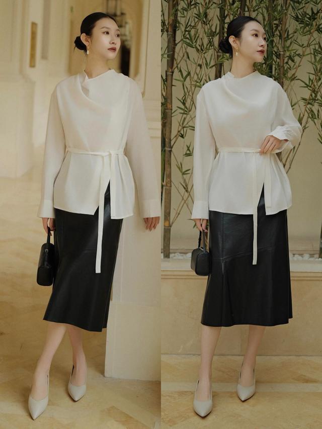 Tips①:白衬衫+玄色皮简洁筒裙。