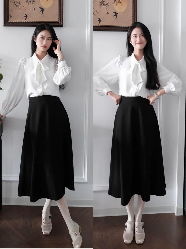 A 字半身裙穿在身上就有一种利落感,我们不错在上衣高下点功夫,选拔一些相比有温心绪或者有女东谈主味的上衣来穿搭,确乎上身戒指之后显得更柔好意思,举例上头这一件玄色的灯笼袖衬衫配高腰收腰 A 字半裙,就能让穿搭者变得愈加优雅干练。