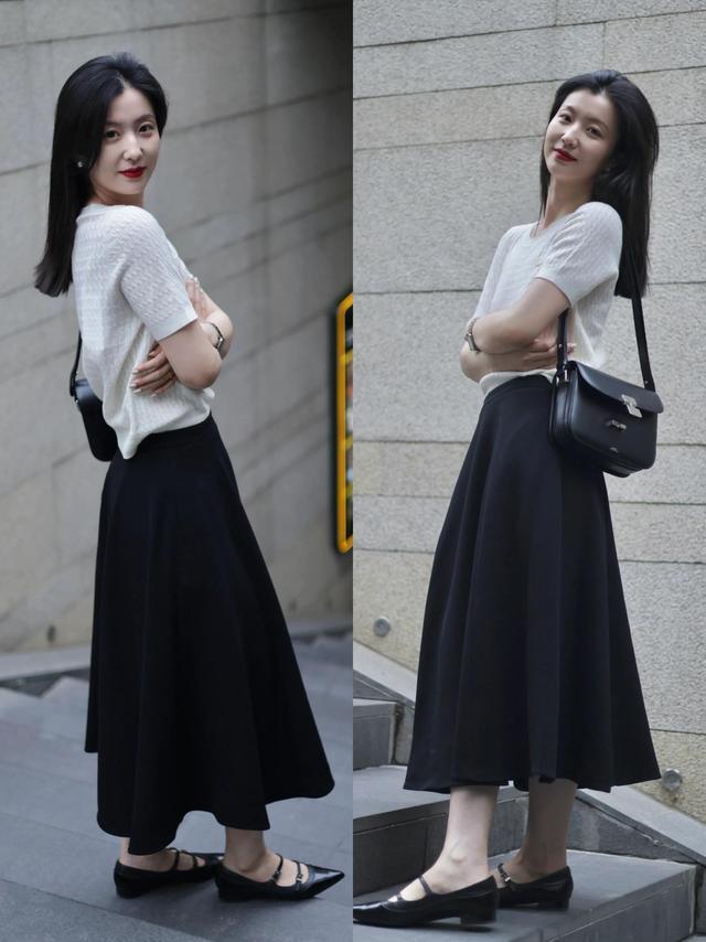 有的技巧穿衣打扮确乎要懂得作念减法搭配,用最肤浅的色调组合也能穿出属于你的好意思。白色诚恳短袖搭配玄色半裙,脚踩玄色低跟单鞋,节约大气。
