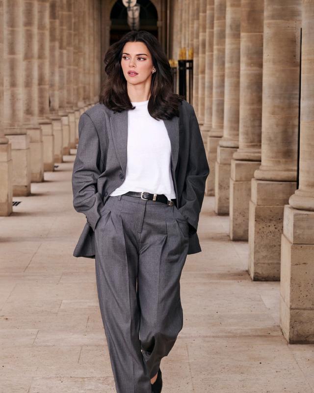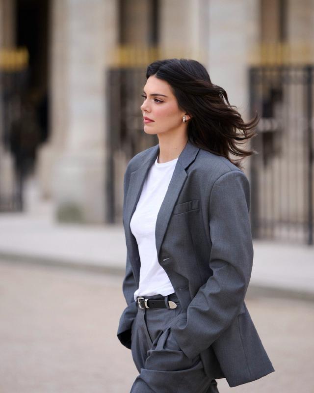 Kendall Jenner一袭灰色套装,
