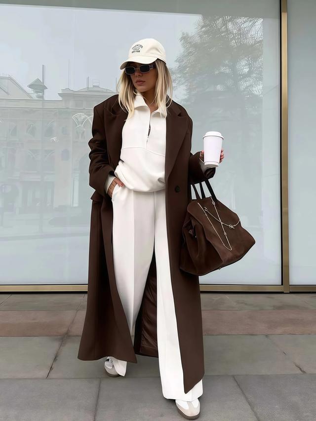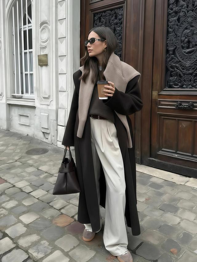 但这组搭配有一个细节许多东说念主忽略了,阔腿裤的裤长最佳盖住鞋面但不拖地,大衣本人就有垂感和重量,淌若裤子再堆在脚面上,下半身会显得千里重拖拉。