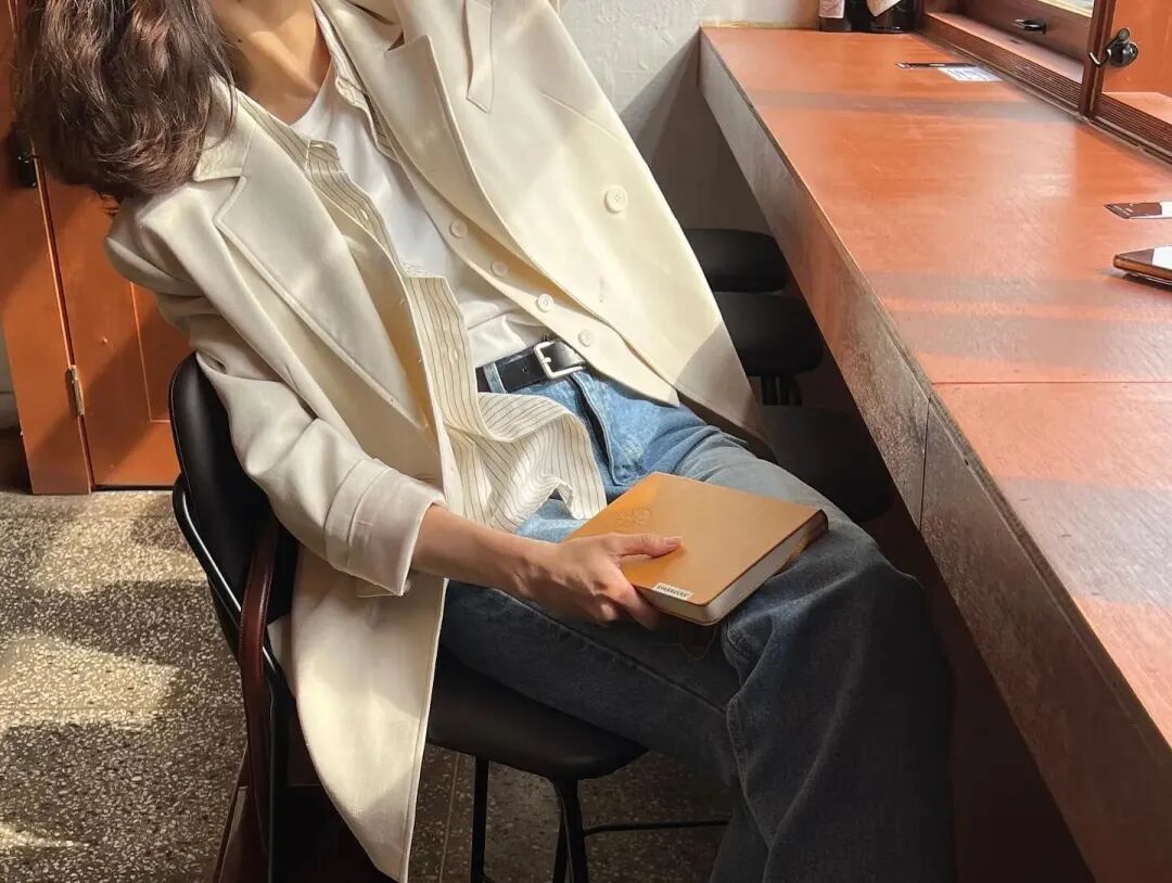 卡其西装外衣配高腰九分牛仔——腰线皆整,篮球投注app裤脚利落,下摆与鞋面之间留出呼吸的间隙。