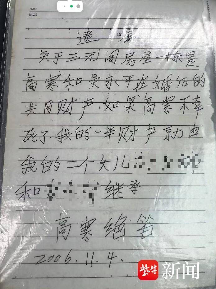 高寒遇难后,在她的衣裳中发现了事前写好的遗嘱,内容是将遗产归于两个女儿通盘。题名为高寒,并注明“绝笔”字样。显然,她依然意想想会遭棘手。