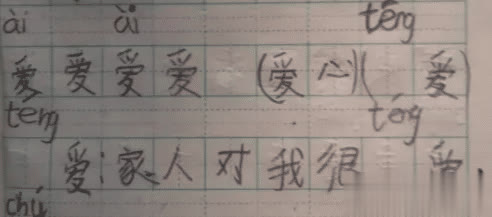 这是大宝二年纪的功课,用 “爱”组词造句,我定睛一看,蓝本是: