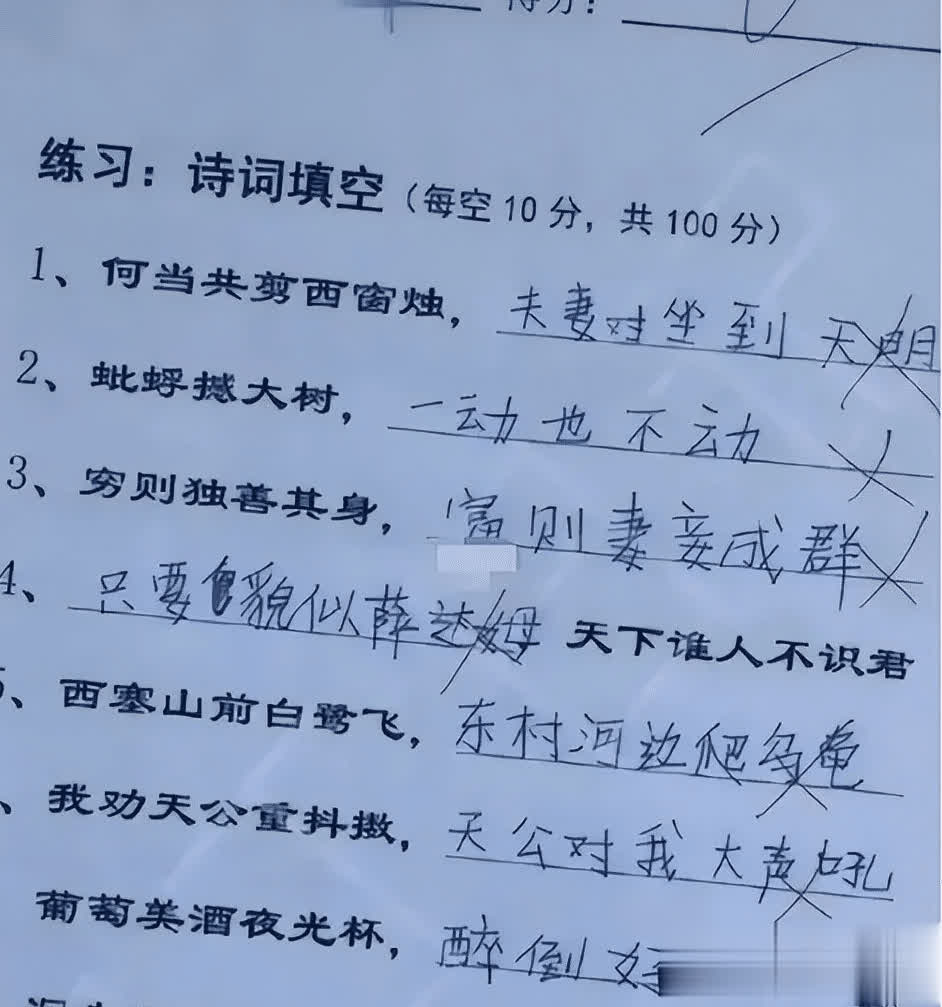 望望底下这个“0分试卷”,诗词填空题,东谈主小鬼打大的小学生如何自创诗词的: